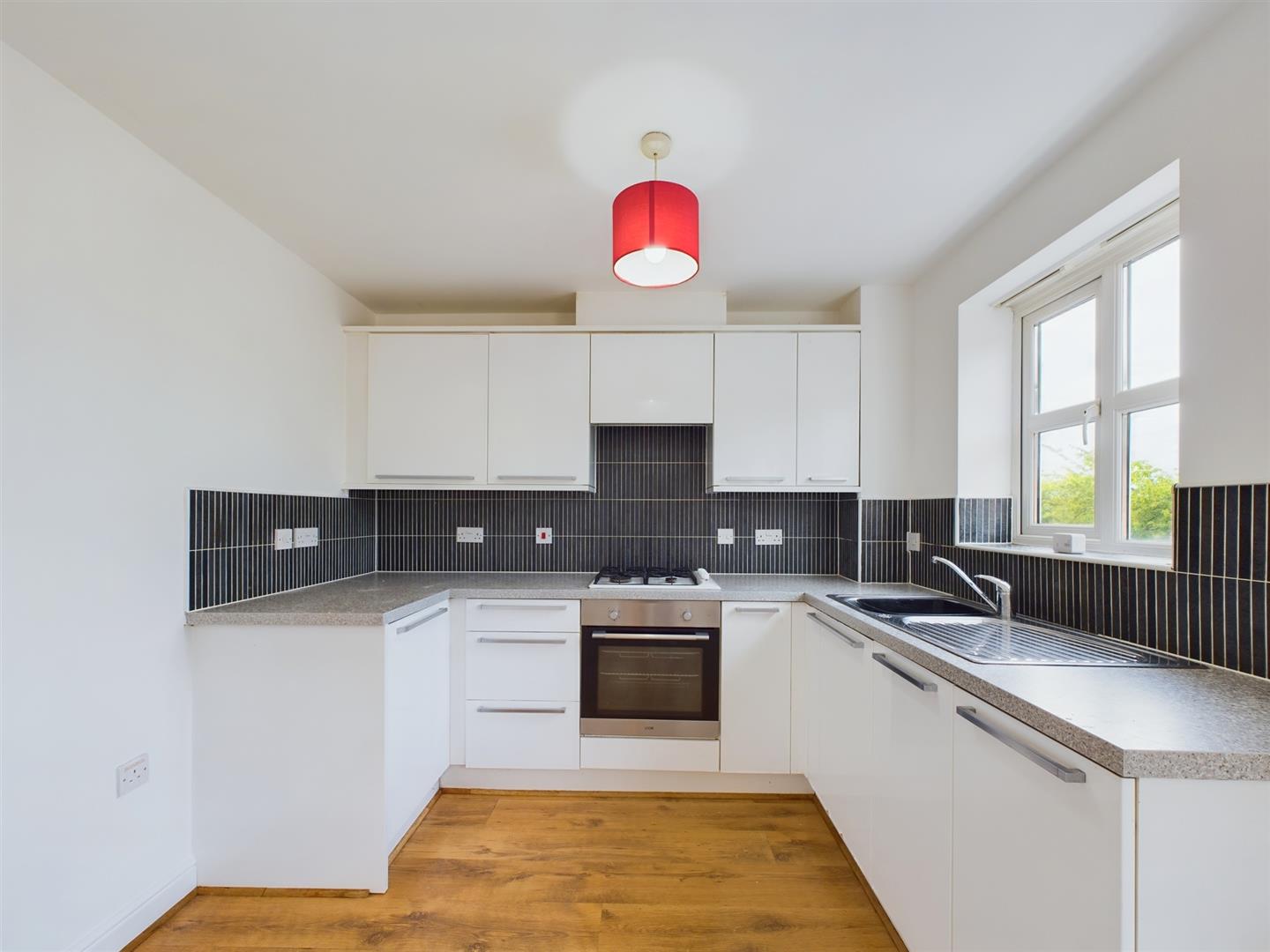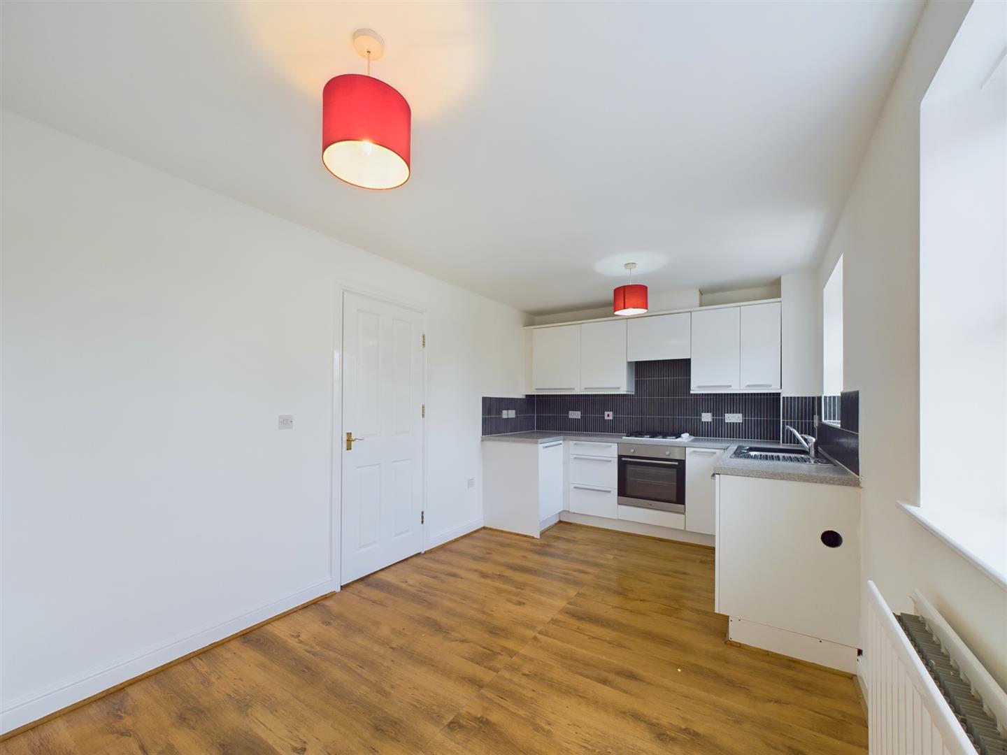 With two Upvc double glazed windows to the front an extensive range of modern fitted cupboards and worktops, built in oven hob and extractor hood, wooden laminate flooring.