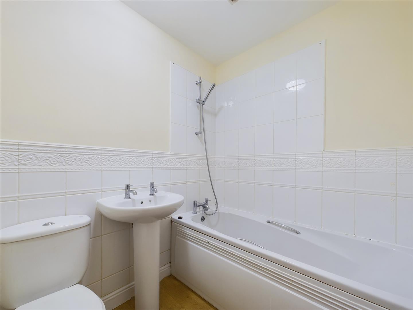 Three piece suite including low level wc, pedestal wash hand basin and a panelled bath with shower attachment , extractor fan and radiator.